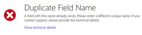 “Duplicate Field Name: A field with this name already exists. Please enter a different unique name. If you contact support, please provide the technical details.”